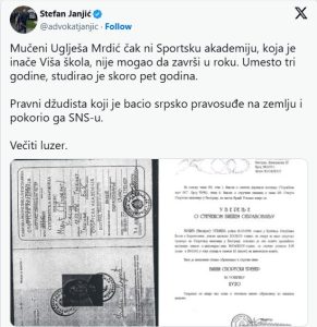 „Mučeni Uglješa Mrdić čak ni Sportsku akademiju, koja je inače Viša škola, nije mogao da završi u roku. Umesto tri godine, studirao je skoro pet godina. Pravni džudista koji je bacio srpsko pravosuđe na zemlju i pokorio ga SNS. Večiti luzer“, objavio je Janjić uz fotografiju Mrdićevog indeksa i Uverenja o stečenom višem obrazovanju.